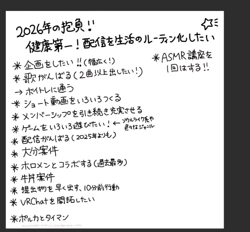 • 特定のコラボ・案件: 尾丸ポルカとのタイマンや、牛丼案件、大分案件の獲得を目標として挙げています。