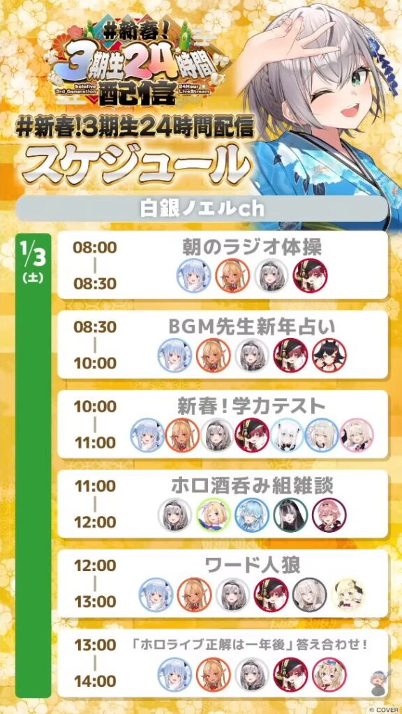• ノエル担当枠の過酷さ: 1月3日の朝8時から14時までの6時間を担当しますが、6つの企画を詰め込みすぎており、本人も「俺の考えた最強の24時間」にしてしまったと自戒しています。